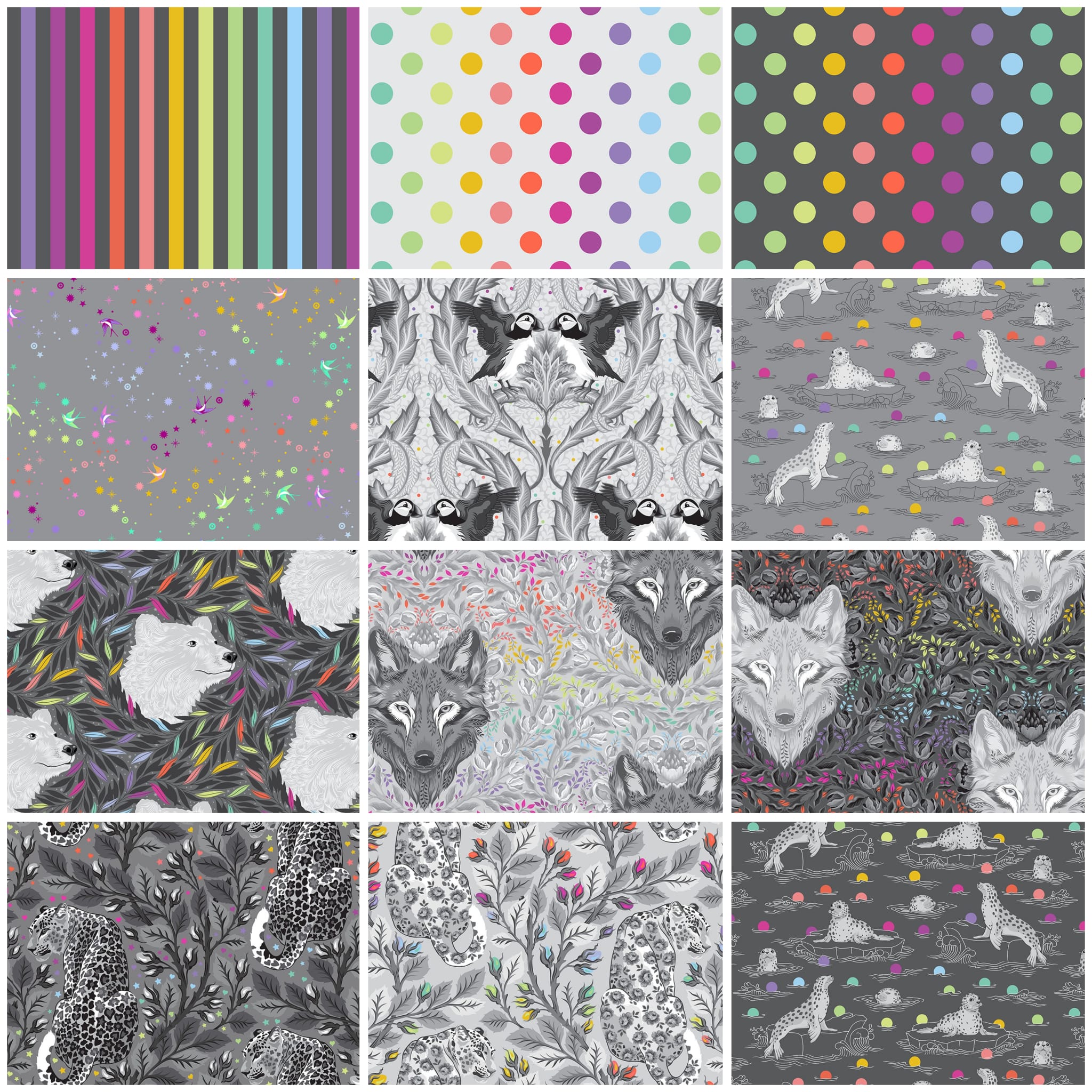 This fat quarter bundle includes eight fabrics from the Graywork collection by Tula Pink for FreeSpirit Fabrics, and four from the Graywork True Colors collection.